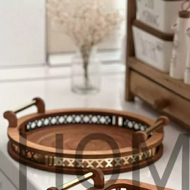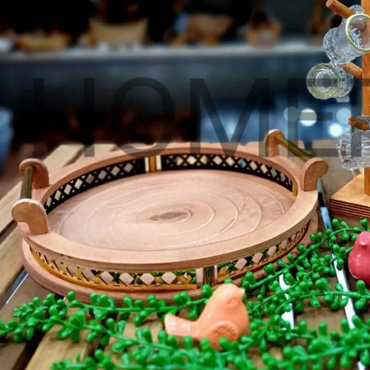 سینی چوبی. مدل گرد. طرح جدید کیفیت بالا شیک. قابل شستو شو سبک دسته پیم فلزی
