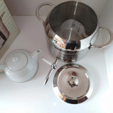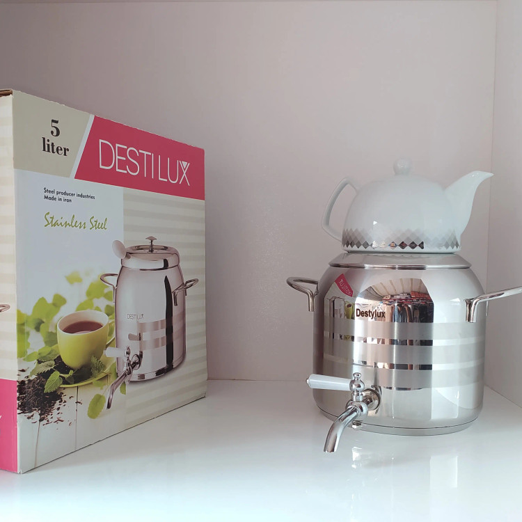 کتری قوری دسی لوکس DESTlUX با افتخار کالای ایرانی با کیفیت میفروشیم ساخت ایران ورق زخیم استیل کف چدن ضخیم دسته فلزی با کیفیت لعاب ضخیم و با کیفیت قوری چینی درجه یک ضرفیت5لیتر قوری 700سیسی